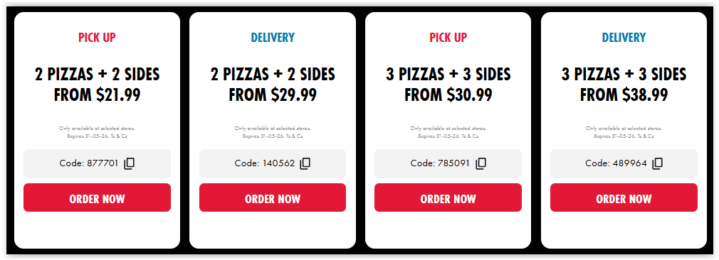 - 3 Pizzas & 3 Sides from $30.99 – Pick-Up or Delivery: Grab three pizzas and three sides to share from $30.99 pick-up, or have them brought to your door for just $38.99.