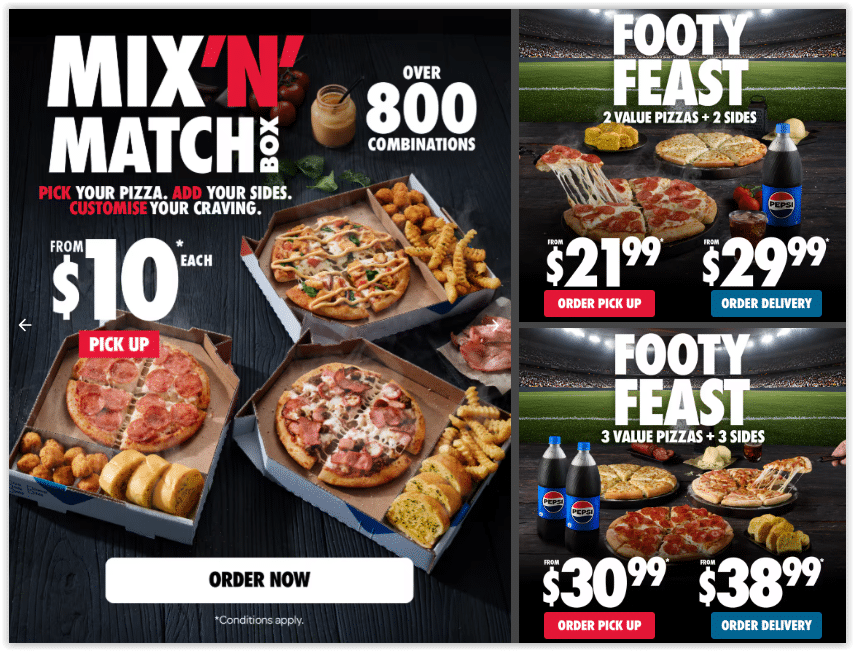 - Mix ’N’ Match Deal from $10 – Create your perfect combo by choosing a pizza and adding your favorite sides. With over 800 possible combinations, you can mix and match your meal starting from just $10 each for pickup.