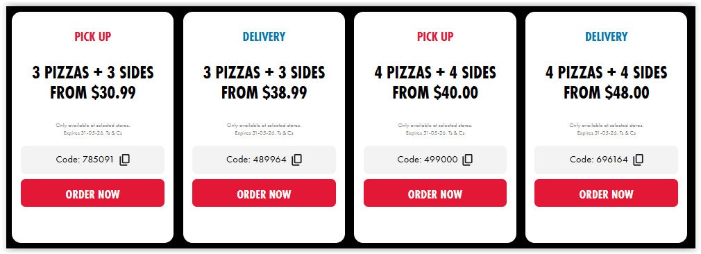 - 3 Pizzas & 3 Sides from $30.99 – Pick-Up or Delivery: Grab three pizzas and three sides to share from $30.99 pick-up, or have them brought to your door for just $38.99.