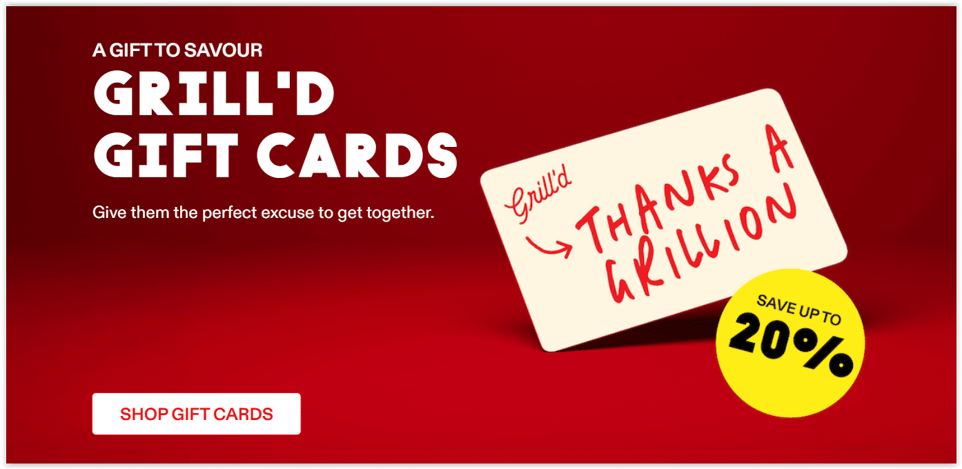 - 10–20% Off Grill’d Digital Gift Cards – Purchase $100 gift cards for $90 or $200 cards for $175. Available for a limited time.