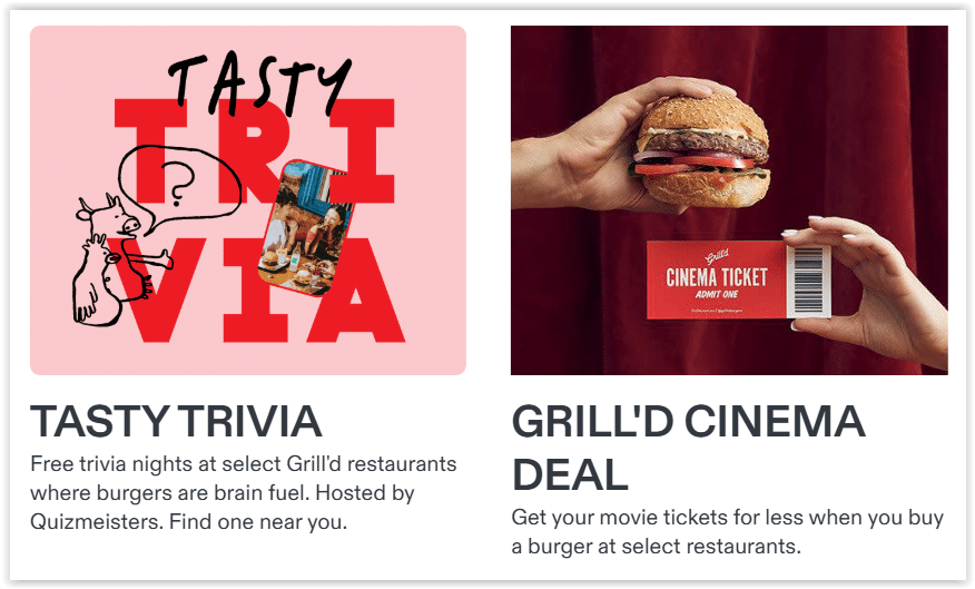 - Burger & a Movie Deal at Grill’d – Add a discounted movie pass to your order and redeem it at a participating partner cinema nearby. Enjoy your favorite burger and catch a film — the perfect combo for a night that’s easy on your wallet. Available at select Grill’d restaurants. T&Cs apply.
