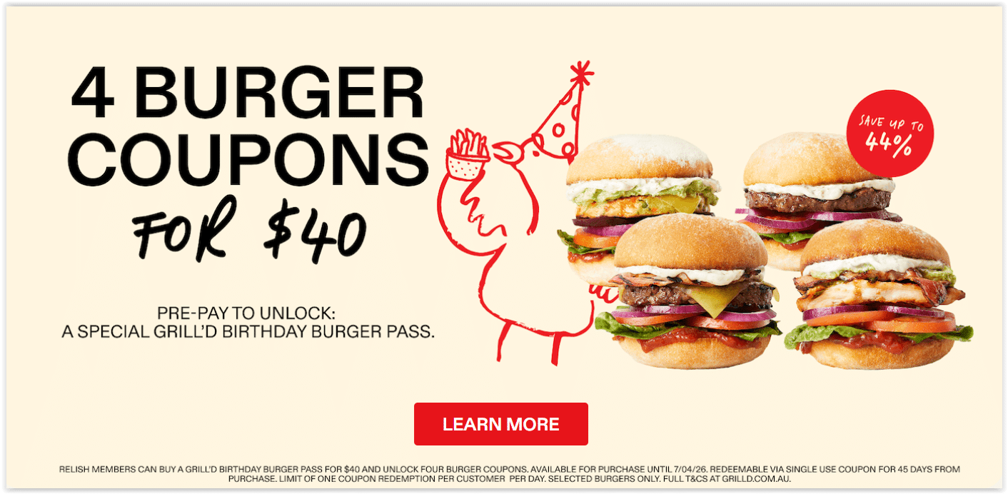 - $40 Burger Pass – Unlock 4 burger coupons for $40 with the Grill’d Birthday Burger Pass at Grill’d. Available for a limited time and redeemable on selected burgers.